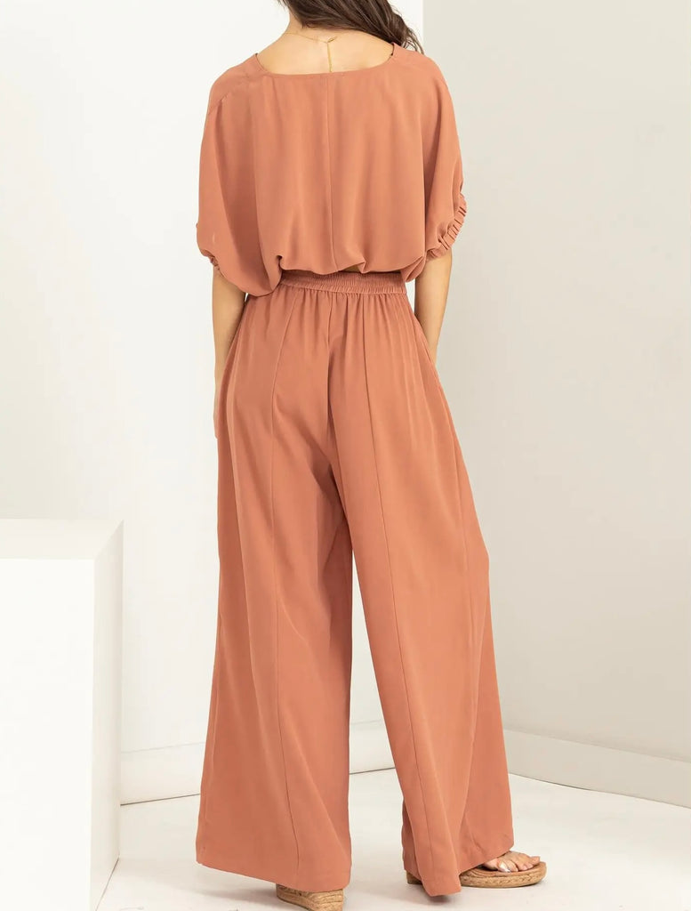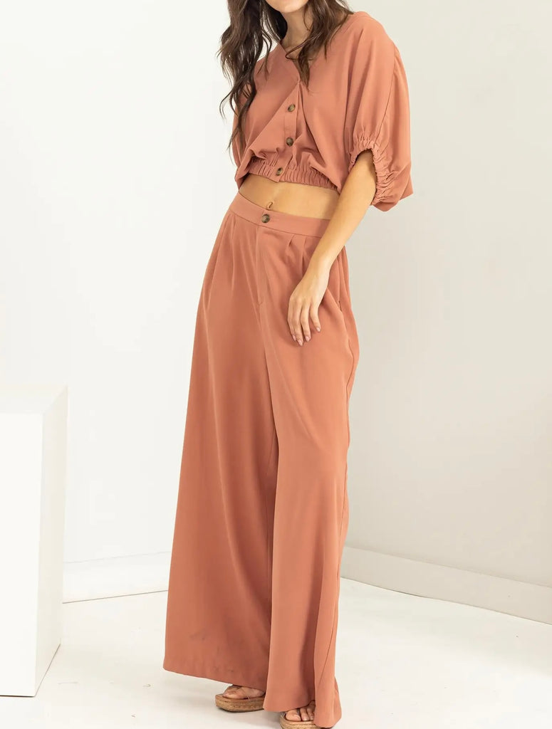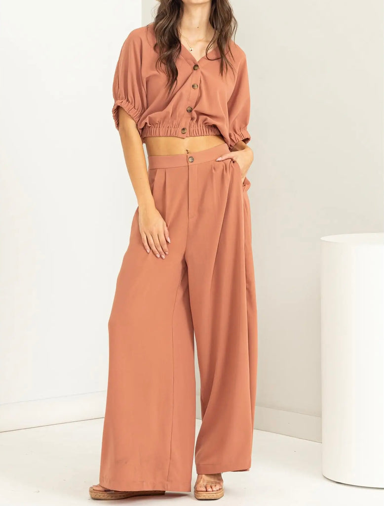 THE BUTTON-FRONT TOP SHAPES A V-NECK AND SHORT SLEEVES WITH CINCHED CUFFS FOR A TRENDY LOOK, WHILE THE ELASTICIZED CROPPED HEM DEFINES THE LOOK. WIDE-CUT PANTS FEATURE A FLATTERING HIGH-RISE SILHOUETTE FOR THAT CHIC APPEARANCE.