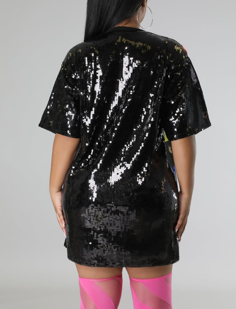 Black Sequin with colored lettering. Chic. Can be worn as dress or shirt. Depending on how you feel. Great quality